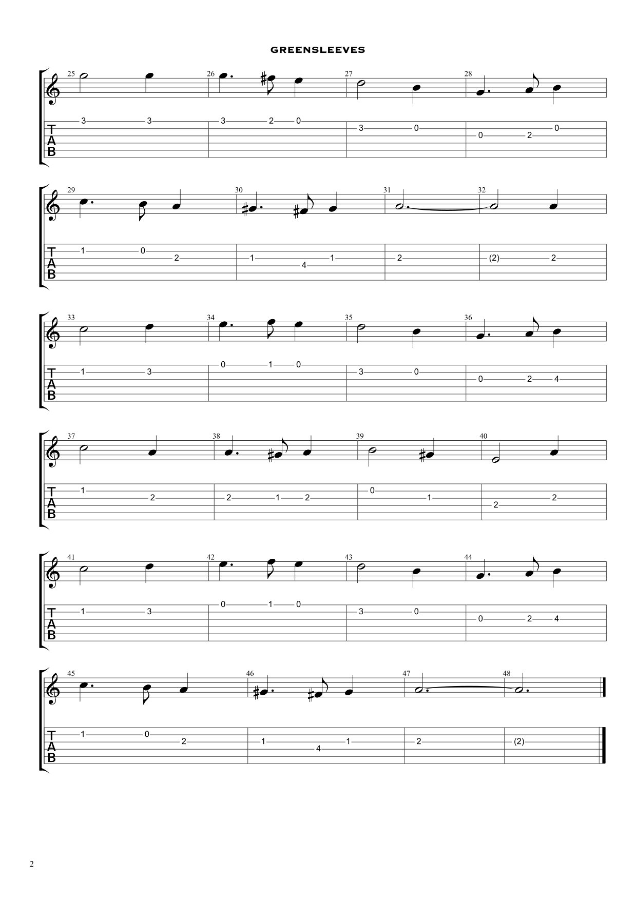 Partitura y tablatura para guitarra, con descarga gratuita en un clic, de la melodía Greensleeves.